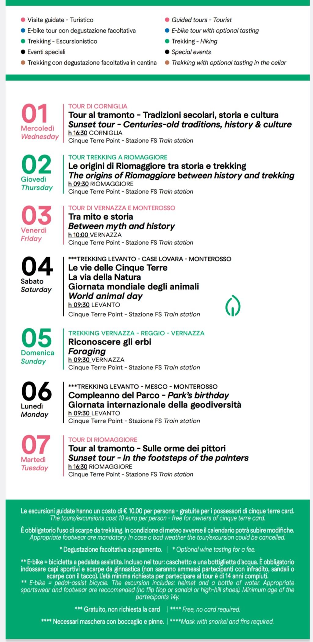 The Cinque Terre National Park presents a rich calendar of guided excursions with the Walking Park from October 1 to 7, 2025. The program includes hiking, cultural visits, and breathtaking sunset tours. This is a unique opportunity to explore trails, history, and local traditions with expert guides. All tours depart from the Cinque Terre Point located at the train stations and cost €10 per person, free for holders of the Cinque Terre Card.